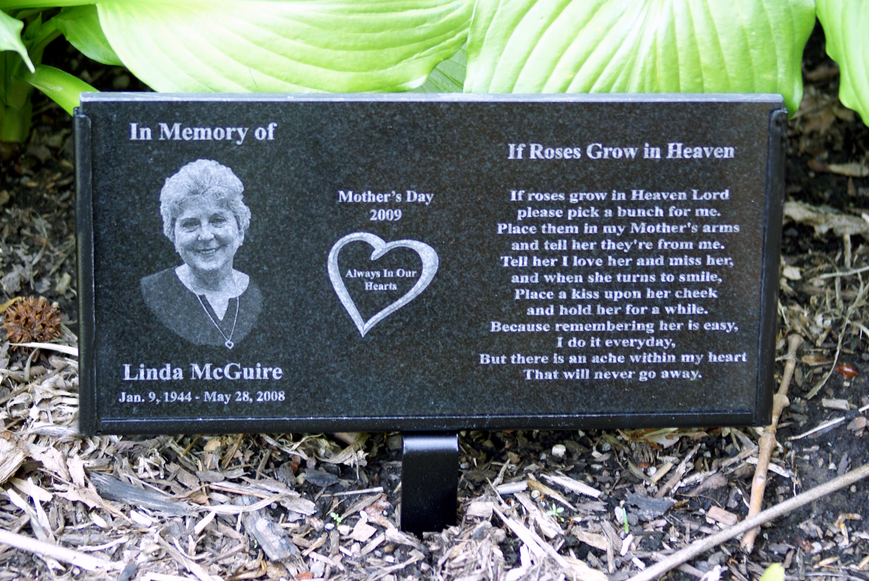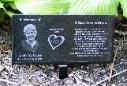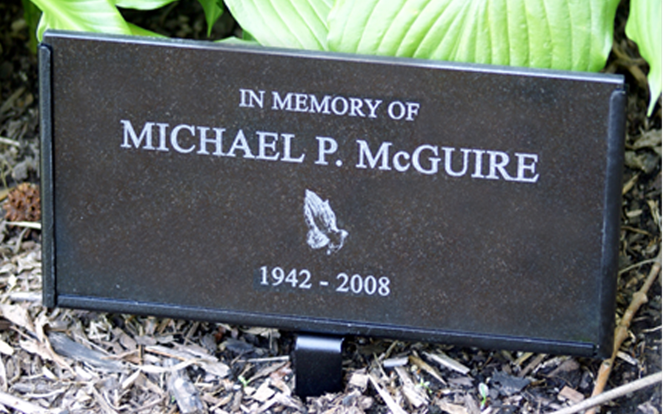 Memory Stones are 6" x 12" x 3/8" and include a powder coated cemetery stand.